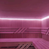 Luxieuze ingerichte sauna. Deze sauna is geheel naar eigen wens samen te stellen, zoals onder andere de afmetingen, verschillende houtsoorten en diverse kleuren steenstrips.