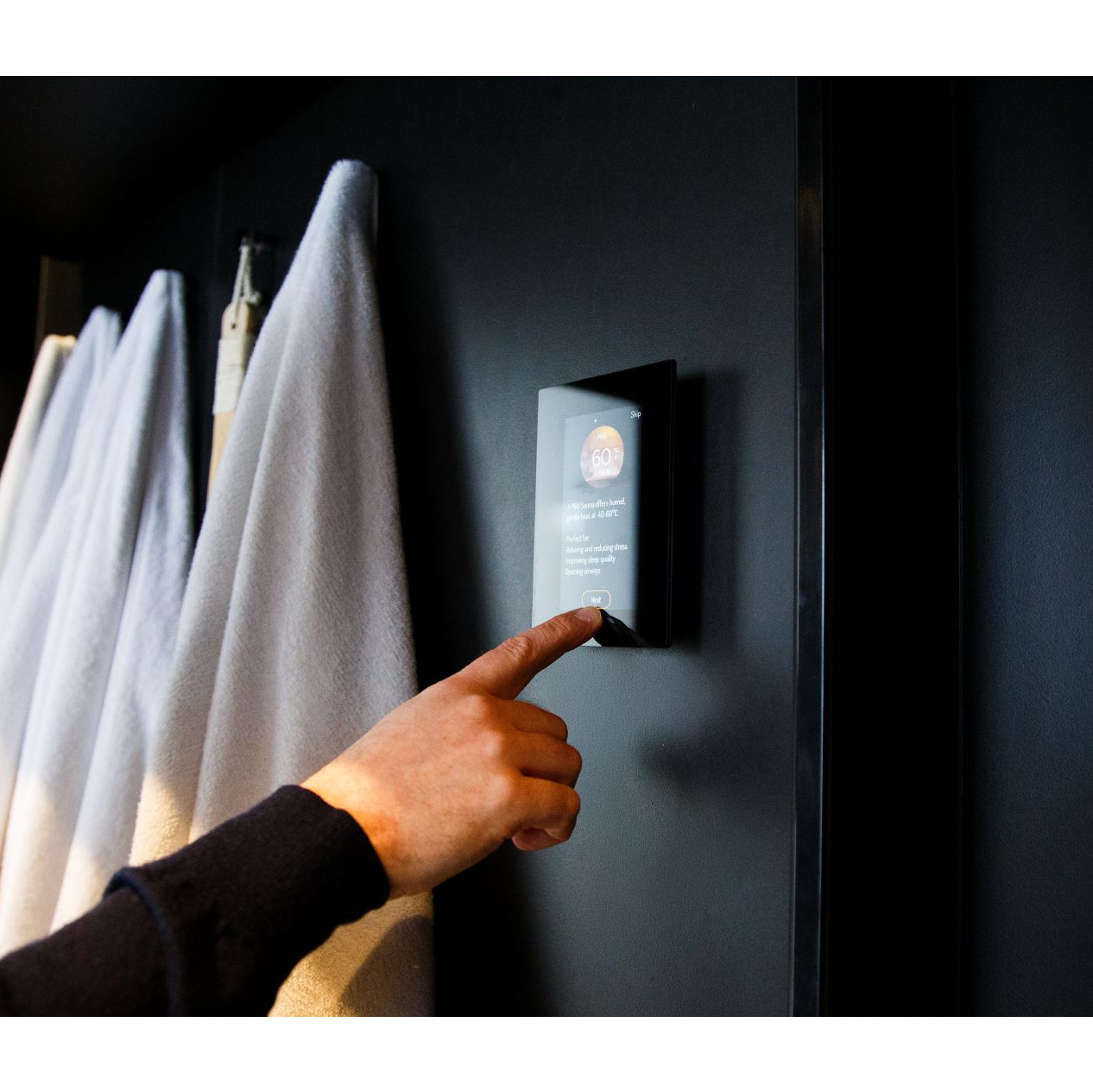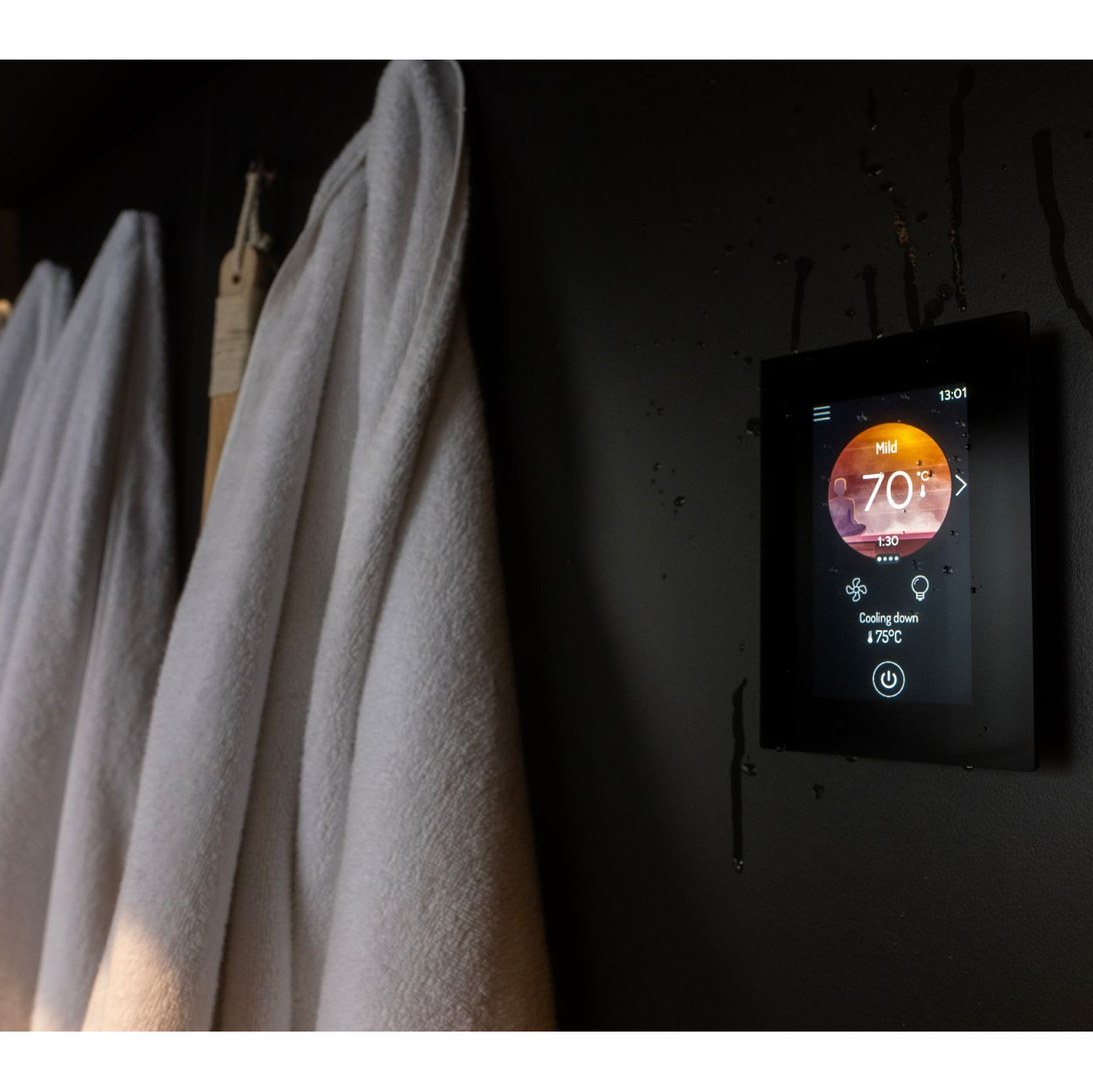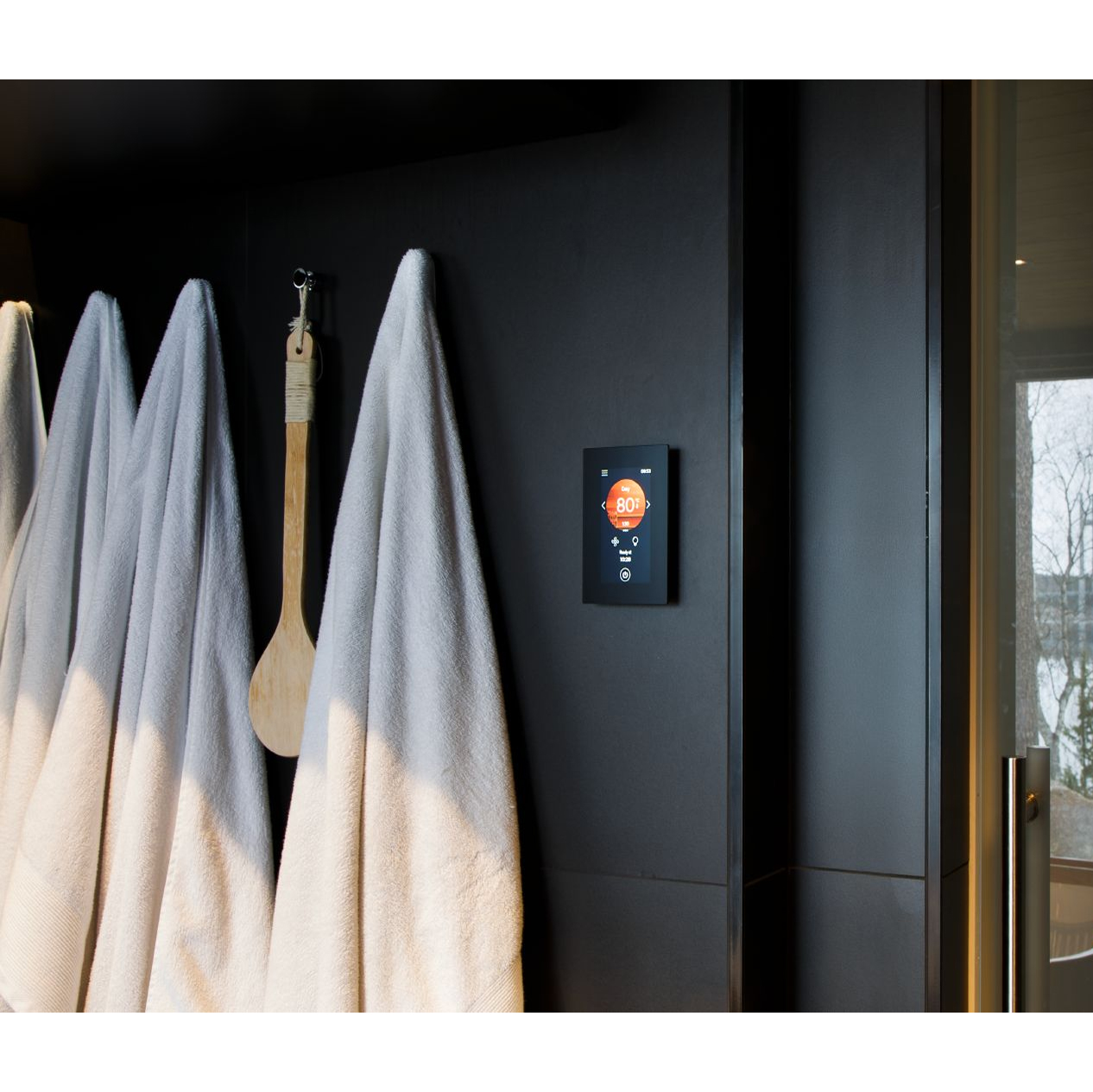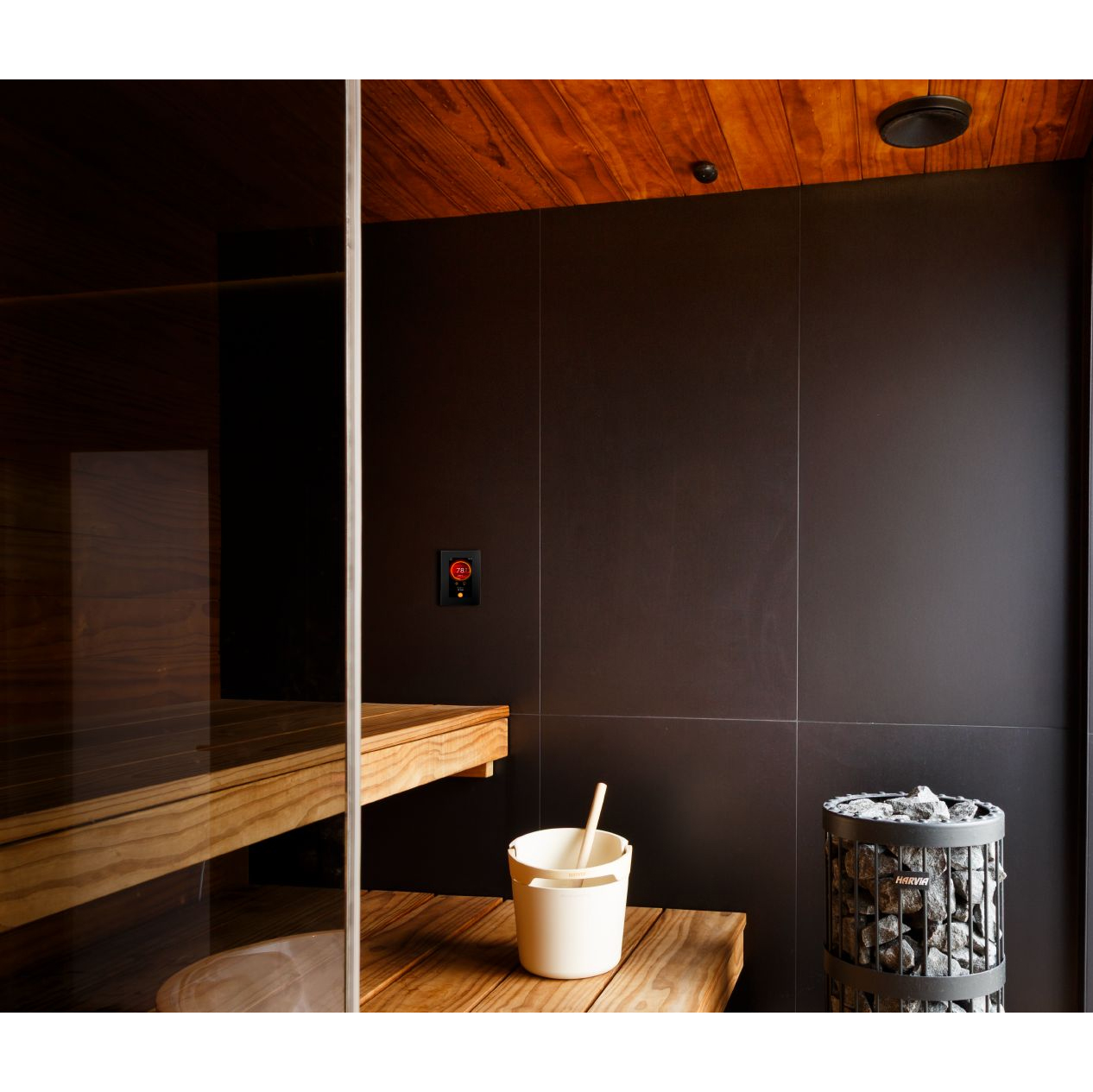 Het glazen touchscreen kan zowel opbouw als inbouw worden geplaatst en is geschikt voor installatie in de sauna, badkamer of woonkamer. De interface heeft dezelfde moderne uitstraling als de MyHarvia 2-app en toont duidelijk wanneer de sauna klaar is voor gebruik.